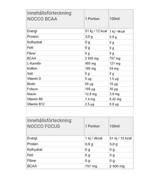 Ingredienser NOCCO BCAA :Kolsyrat vatten,grenade aminosyror BCAA(l-leucin, l-valin, l-isoleucin),koffein,grönt te extrakt,vitaminer(niacin, vitamin B6, folsyra, biotin, vitamin D, vitamin B12),surhetsreglerande medel(citronsyra, natriumcitrat),arom,sötningsmedel(sukralos),färgämne(betakaroten). Hög koffeinhalt (55 mg per 100 ml).Ingredienser NOCCO FOCUS:Kolsyrat vatten, koffein, grönt te-extrakt, vitaminer (niacin, vitamin B6, folsyra, biotin, vitamin D, vitamin B12), surhetsreglerande medel (citronsyra, natriumcitrat), arom (hallon), sötningsmedel (sukralos), färgande vegetabiliskt livsmedelsextrakt.